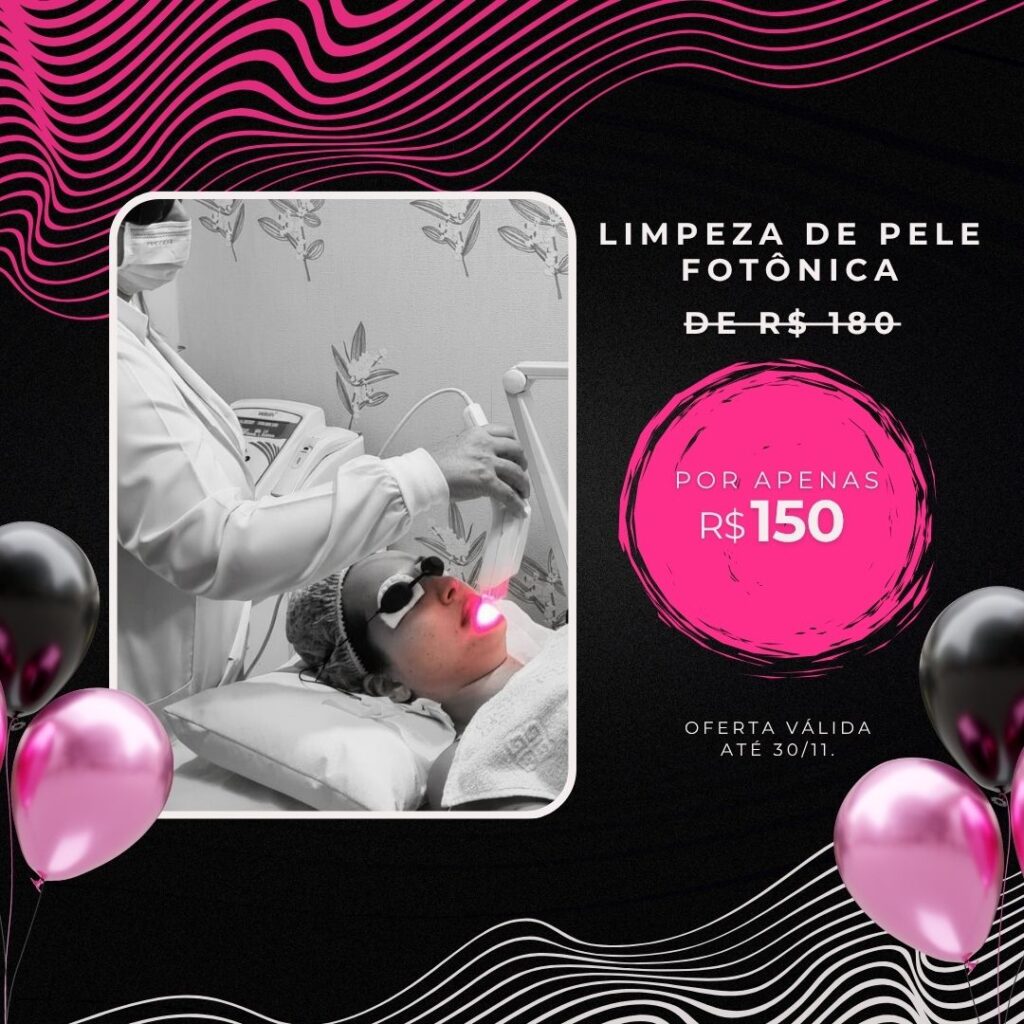 Outro procedimento muito requisitado é a Limpeza de Pele Fotônica, que utiliza tecnologia de luz para auxiliar na oxigenação da pele, estimular recuperação e trazer brilho imediato. O valor, que antes era de R$180, durante a Black Friday está por R$150. É uma excelente opção para quem deseja resultados rápidos, especialmente antes de eventos, festas ou compromissos importantes.